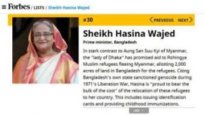 ফোর্বসের ওয়েবসাইটে মিয়ানমারের নেত্রী অং সান সু চির বিপরীত হিসেবে উল্লেখ করে শেখ হাসিনাকে ‘লেডি অব ঢাকা’ আখ্যায়িত করা হয়েছে। এতে বলা হয়েছে, মিয়ানমার থেকে পালিয়ে আসা রোহিঙ্গা শরণার্থীদের জন্য সহায়তার অঙ্গীকার করেছেন শেখ হাসিনা। বাংলাদেশে তাদের আশ্রয়ের জন্য দুই হাজার একর জমি বরাদ্দ দিয়েছেন তিনি