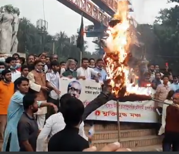 কুশপুত্তলিকা দাহ একটি বিক্ষোভ মিছিল বের করা হয়। মিছিলটি শাহবাগ মোড় এসে অবস্থান নেয়। এসময় সংগঠনটির সাধারণ সম্পাদক আল মামুন বলেন, বঙ্গবন্ধুকে অবমাননা করা হয়েছে। এজন্য জড়িতদের গ্রেপ্তারে আমরা ৭২ ঘন্টা আল্টিমেটাম দিয়েছিলাম। কিন্তু এরপরও গ্রেপ্তার না হওয়ায় আমরা শাহবাগ অবরোধ করেছি।